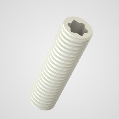 Es handelt sich um eine Vollgewindeschraube ohne Kopf, die sich durch ihren 6-Lobe Antrieb auszeichnet. Die Innensechskantschraube, auch Gewindestift genannt, ermöglicht das Spannen eines Werkstücks aber auch dessen Justierung. Es folgt ähnlich der deutschen Norm DIN 913.