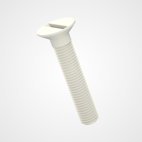 This is a metric plastic screw is manufactured according to DIN 963 standard and more or less similar to ISO 2009. It has a slotted head to suite a flat screwdriver blade and is made from polyamide (nylon). Other materials are available on request.