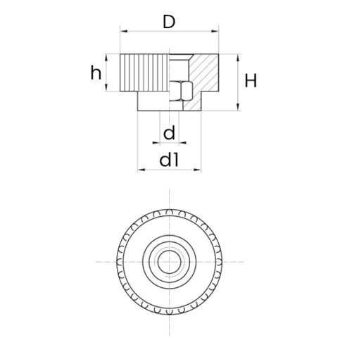 This is a black nylon knurled nut with a zinc plated steel thread insert. It is a through nut with a head diameter of 20 mm: the BPF 100 model.
