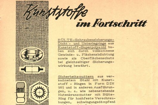 In 1956, after 8 years working with polyamide parts, Mr. Norbert Bülte decided to establish his own fasteners company. He set up his office in the small town of Lüdinghausen in Germany. In collaboration with other companies in the sector, Mr. Bülte invented the Bülte polyamide locking/sealing washer.