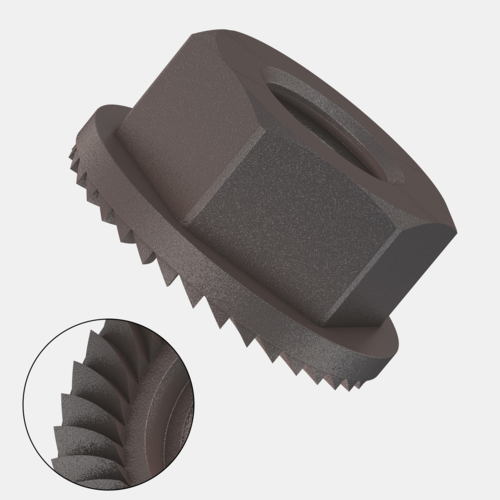 Se trata de unas tuercas hexagonales con arandela de base dentada. Se componen de un collarín estriado que permite prescindir del uso de arandela y asegura un apriete mayor. Ofrecen una superficie de contacto mayor que una tuerca clásica. Con su forma hexagonal, esta tuerca se adaptará a la perfección a todos los montajes.