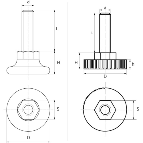Realizzati in Nylon nero, questi piedini di regolazione sono tondi, sia zigrinati che con flangia esagonale. Si può scegliere tra i modelli D25, D30, SF16, SF19, SF20 e SF21. Questi piedini regolabili sono realizzati con una base fissa e rigida.